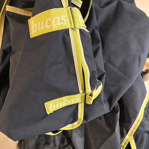 Bucas loimi sininen. Loimessa on Bucas-logokuvioitu sisävuori ja kiristysnyörit. Sopii hevosen suojaksi talliin, ulos tai kuljetukseen. Kuvissa näkyy repeämä, joka vaatii korjausta ennen käyttöä. Repeämä on loimen sisävuoressa. Huomioitu hinnassa!