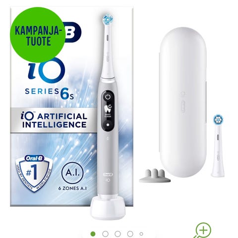 Oral-B iO Series 6 sähköhammasharja valkoinen. Ladattava sähköhammasharja, jossa on useita harjaustiloja ja digitaalinen näyttö varren etupuolella. Pakkauksessa on iO Series 6 -varsi ja pyöreä harjaspää. Harja on yhteensopiva Oral-B iO -harjaspäiden kanssa ja sitä voidaan käyttää päivittäiseen hampaiden puhdistukseen. Laite on suunniteltu aikuisille ja sitä voidaan käyttää yhdessä Oral-B -sovelluksen kanssa älypuhelimessa.uusi Vamaamaton
