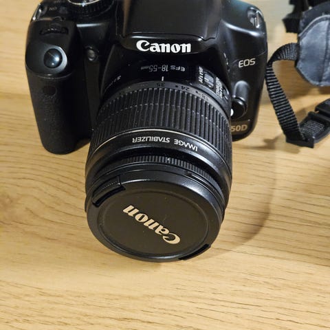 Canon EOS 450D digitaalinen järjestelmäkamera, musta. Kamerassa on vaihdettava objektiivi (Canon EFS 18-55 IS), rungossa EOS DIGITAL -hihna sekä akku ja Canon-laturi. Takana on LCD-näyttö, josta voi säätää kuvaustiloja ja asetuksia.