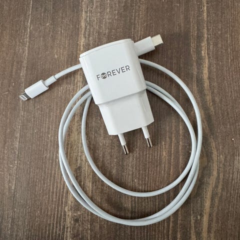 Apple laturi ja Lightning‑kaapeli. Valkoinen verkkovirtalaturi, jossa on europlugiliitin (2-napainen pistoke) ja erillinen USB–Lightning-latauskaapeli. Sopii Apple-laitteille, joissa on Lightning-liitin, kuten iPhone, iPad ja iPod, yhteensopivuuden mukaan. Kaapelia voi käyttää sekä lataukseen että tiedonsiirtoon yhteensopivien laitteiden ja laturien kanssa.