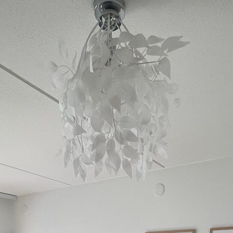 Valkoinen kattovalaisin, jossa kangasvarjostin ja hillitty lehtikuvio. Varjostin on sylinterin muotoinen ja kiinnittyy metallirunkoon. Sopii yleisvaloksi esimerkiksi olohuoneeseen, makuuhuoneeseen tai ruokailutilaan. Maksu käteisellä.