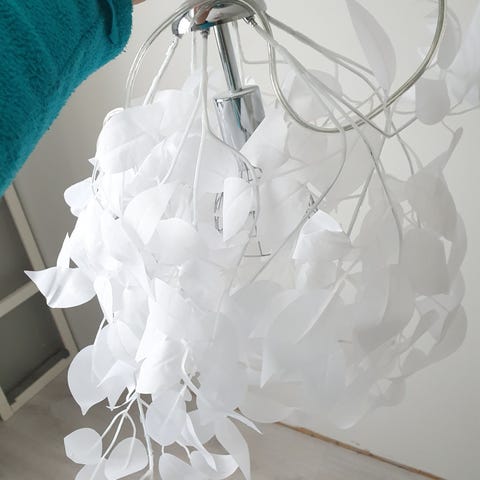 Valkoinen kattovalaisin kangasvarjostimella lehtikuviolla