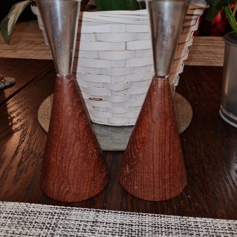 Kuvien mukaiset kynttilänjalat. Toisen ”hatussa” enempi taitosta ja varmaan liian isoa kynttilää painettu väkisin niin tyvestä painautunut. Käytön jälkeä jonkin verran, kiillottamalla ison osan saa pois. Noin mitat: korkeus 21cm, halkaisija 6cm. Bruttopaino n. 470g yhteensä. Kipsitäyte jaloissa.