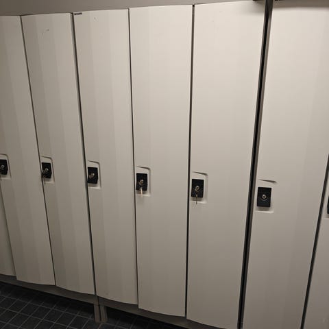 10 erillistä lokeroa. 9 lokeroa lukittavia avaimilla, yhdessä lokerossa ei ole avainta.