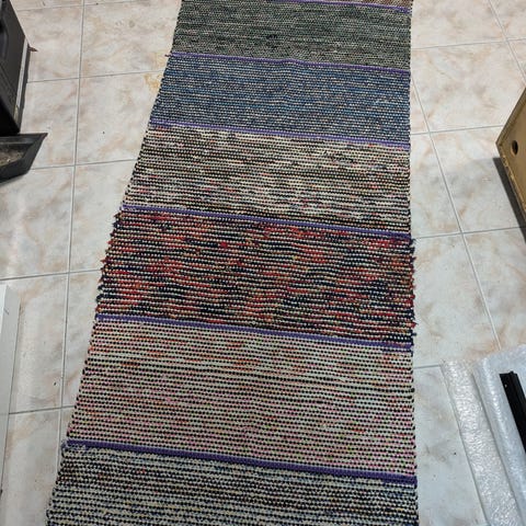 Monivärinen räsymatto, pituus n. 235 cm, leveys n. 62 cm. Ollut käytössä koirataloudessa, pesen hajusteettomalla pesuaineella ennen myyntiä. Nouto noljakasta.