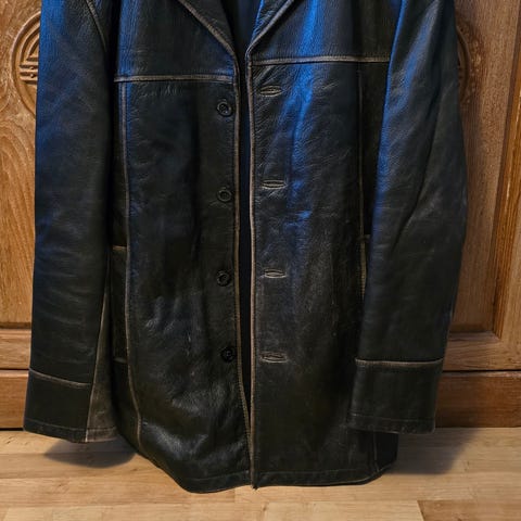 Nahasta tehty, pitkä vetoketjullinen nahkatakki hienolla leikkauksella.