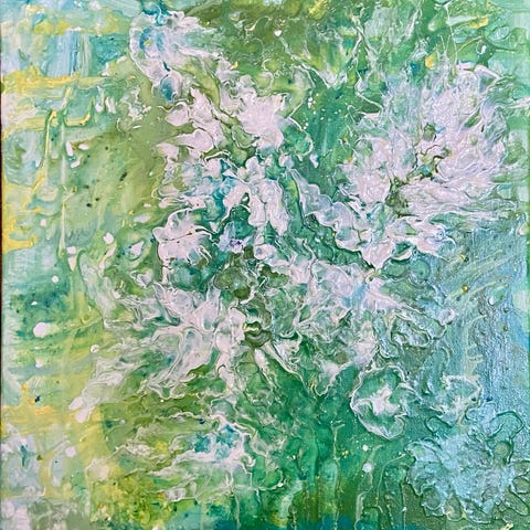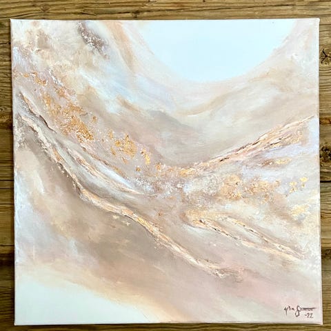 ”Winter Flow” maalaus, koko 40x40 cm. Abstrakti talviaiheinen maalaus, jossa sinisen ja valkoisen sävyjä sekä ruskeaa.