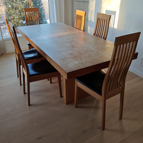 Classicco ruokapöytä ja 6 tuolia. Jämäkkä massiivikoivu ruokailuryhmä . Normaalia käytön jälkeä löytyy. Paikan päällä saa arvioida ostaako vai ei.
