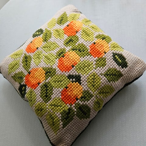 Vintage ristipistotyynyt, tausta tarvitsee uusimista/pesua, toinen on melko hyväkuntoinen, muutama pieni läiskä toisella puolella. Koot noin 35x35cm