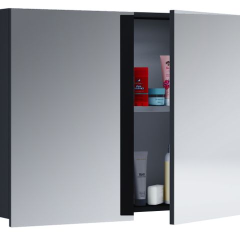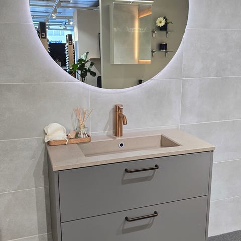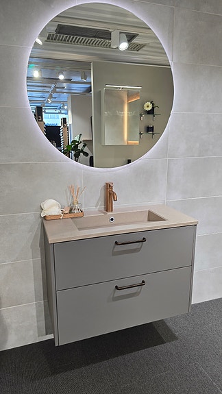 Novart WC-mallikalusteet Hyvinkään myymälässä. Ovet tummaa puukuvioista kalustelevyä. Leveys 805mm. Peilikaappi, allas ja hana kuuluu hintaan.