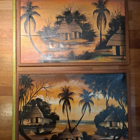 Kaksi kehystettyä Afrikasta tuotua taulua yhteishintaan 50e. Taulun korkeus 26cm ja leveys 30cm.