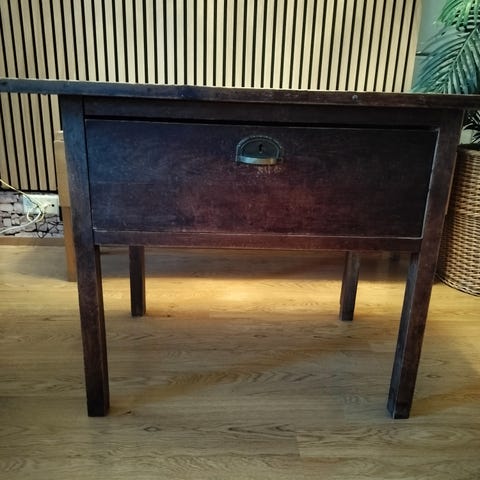Puu taittopöytä säilytyskaapilla, ruskea. Pöydässä on keskiosassa kaappimainen runko ja molemmilla sivuilla alas taittuvat lisälevyt, joita tukevat erilliset jalat. Pöytälevy ja runko ovat puuta, pinnassa näkyy käytön ja iän jälkiä. Sopii esimerkiksi ruokapöydäksi, sivupöydäksi tai työpöydäksi tiloihin, joissa tarvitaan säädettävää pöytätilaa ja säilytystilaa samassa kalusteessa.