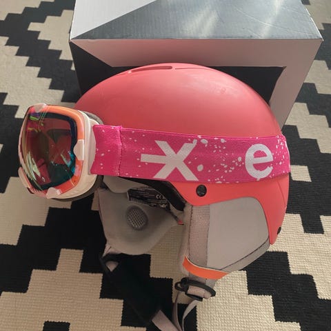 Laskettelukypärä ja laskettelulasit. Kypärä on vihreä, siinä on säädettävä leukahihna ja istuvuus. Takana on kiinnike laskettelulaseille. Laskettelulaseissa on valkoinen kehys, musta joustava hihna ja oranssit peililinssit. Sopii lasketteluun ja lumilautailuun. Koko 55-58cm. M