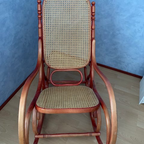 Hyväkuntoinen mekanismillinen täyspuinen keinutuoli. Ollut tummanruskea, maalattu siististi kalustemaalilla valkoiseksi. Hyväkuntoiset pehmusteet myös itse tehty, näissä toinen puoli harmaa, toinen valkoinen, ks kuvat. Istuinosassa ”nahka” keskellä tummanruskea, jää pehmusteen alle piiloon.