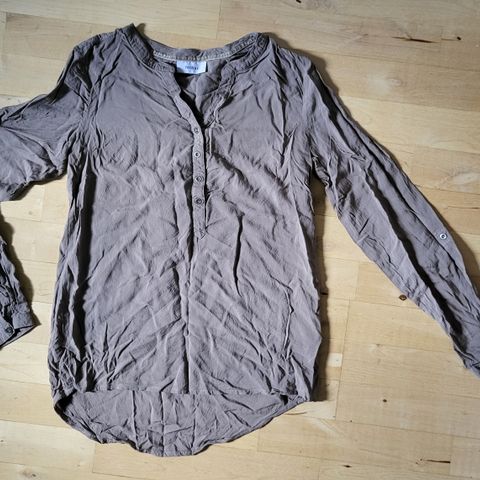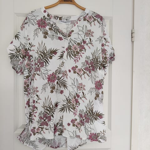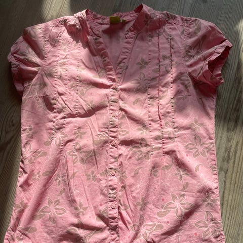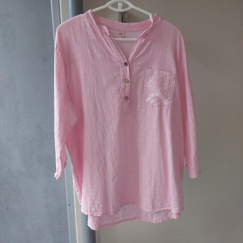 Uusi/käyttämätön naisten paita, koko 46/48. Väri vaaleanpunainen. Materiaalina pääosin polyesteri, mukana myös viskoosia ja elastaania, mikä tekee kankaasta joustavan ja laskeutuvan. Paidassa on pyöreä pääntie ja noin 3/4-pituiset hihat. Kuminauha helmassa. Kainalo-kainalo n. 70 cm, eli rinnanympärys n. 140 cm, niska-helma mitta n. 72 cm.