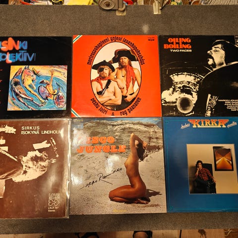 Läjä vinyylejä, levyt visuaalisesti ok kuntoisia kansien kunto ei enää parhain.