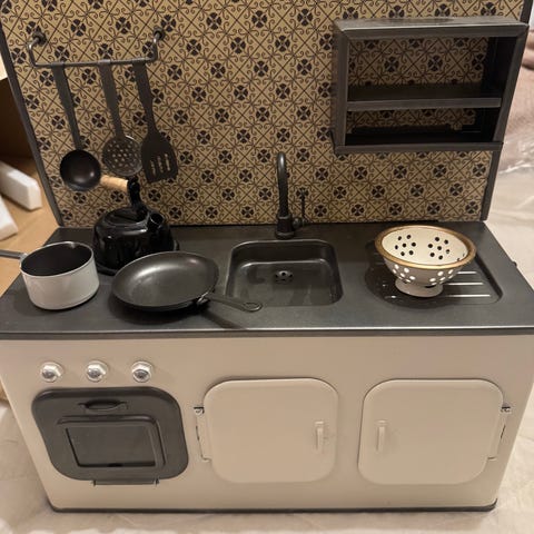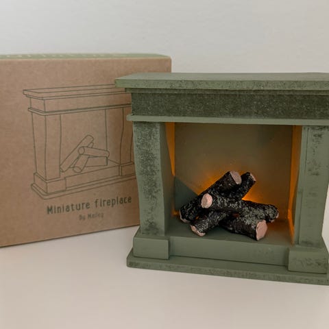 Maileg puinenleikkihella ja jääkaappi. Settiin kuuluu uuni ja jääkaappi hyllyillä ja ylälaatikolla.