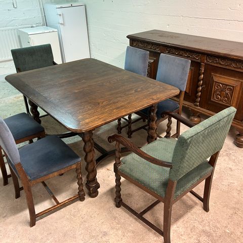 Ruokailuryhmä, johon kuuluu suorakulmainen puinen ruokapöytä ja kuusi tuolia. Pöydässä on tummanruskea puupinta ja sorvatut jalat. Tuoleissa on käsinojat kahdessa tuolissa ja verhoiltu istuin sekä selkänoja ruskeasävyisellä, kukkakuviollisella kankaalla. Sopii ruokailutilaan tai olohuoneeseen useamman hengen istuinryhmäksi.