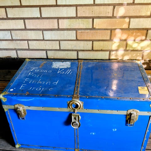 Vanha metallinen matka-arkku ns ameriikan arkku. Väriltään tumma, mustaan taittava pinta, kulmissa ja lukitusosissa näkyy kulumaa ja patinaa. Arkussa on metalliset salvat ja keskellä lukko-osa sekä sivuilla kantokahvat joista toinen rikki.