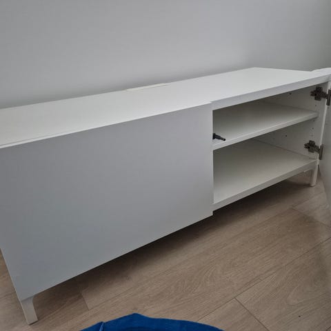 IKEA BESTÅ tv-taso. Musta runko, etusarjassa puunsävyinen raitakuvioitu ovi. Avohyllyt ja ovellinen säilytystila esimerkiksi viihde-elektroniikalle, peleille ja kirjoille.