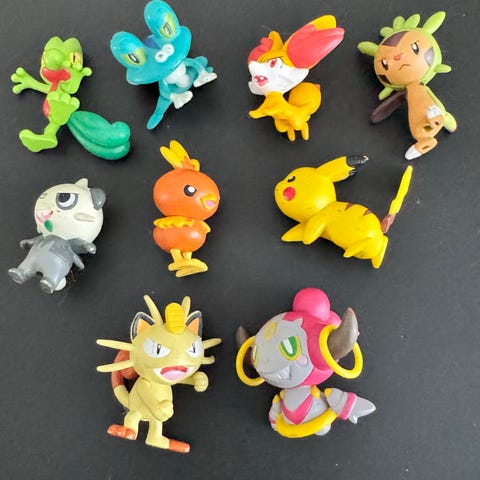Setti erilaisia ja erikokoisia Pokemon aiheisia hahmoja ja pari kuulaa. Siistit ja ehjät, pientä kulumaa osassa.