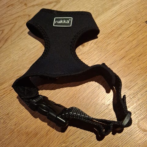 Rukka koiran valjaat, koko M. Säätövara noin 50–80 cm (19,5–31,5 tuumaa). Väri musta, heijastintikkauksilla. Valjaissa on pehmustetut osat koiran rintaa ja selkää vasten sekä säädettävät hihnat. Selkäosassa on metallinen D-rengas talutushihnan kiinnitystä varten sekä pikalukot helpottamassa pukemista ja riisumista. Soveltuu keskikokoisille koirille arkikäyttöön ja lenkkeilyyn.