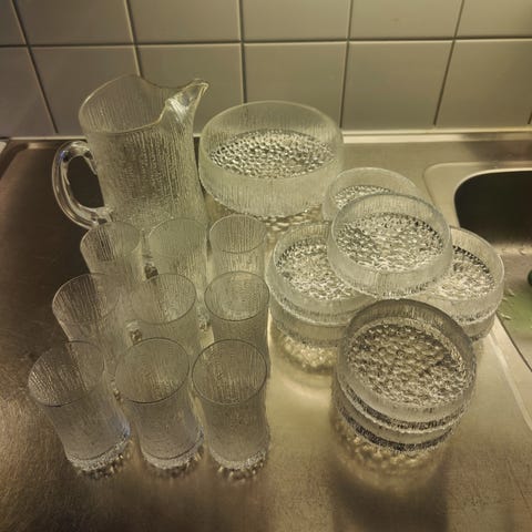 Ultima Thule on Tapio Wirkkalan suunnittelema ja yksi Iittalan tunnetuimmista lasisarjoista. Lautasia (18,5 cm) 6 kpl, Lautasia (15 cm) 6 kpl ja Kulhoja 3 kpl. Hinta on yhteishinta kaikille astioille.