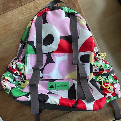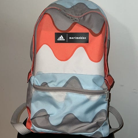 Kerran selässä käynyt Marimekon ja Adidaksen yhteistyöllä tehty reppu.