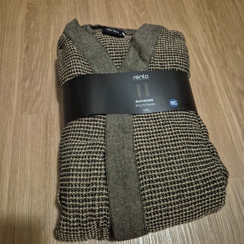 Rento Kenno kylpytakki musta/harmaa koko L/XL. Reilun kokoinen. Mukava kylpytakki kierrätyspuuvillasta. Käyttämätön.