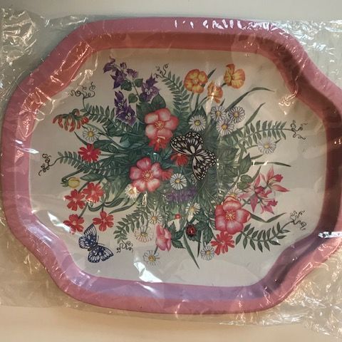 Soma pieni Zhostovo kukkakoristeinen muovitarjotin.