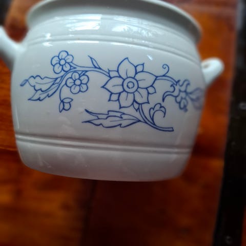 Arabia kulho, jossa kaksi vastakkaista kahvaa. Valkoinen lasite ja sininen kukkakoriste kulhon etupuolella. Soveltuu esimerkiksi tarjoiluun tai säilytykseen keittiössä. Materiaalina lasitettu keramiikka. Korkeus 11cm