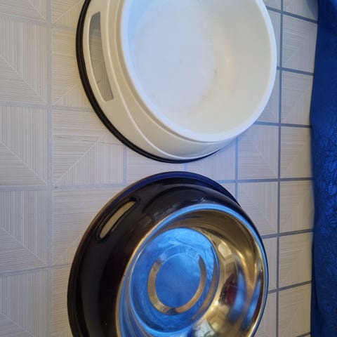 Kolme koirankuppia, matkavesikuppi ja panta keskikokoiselle koiralle.