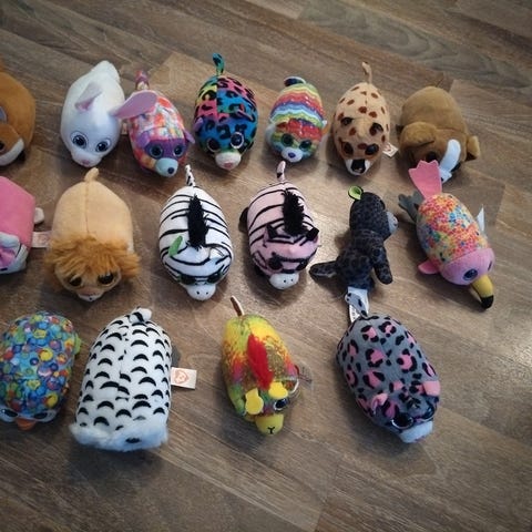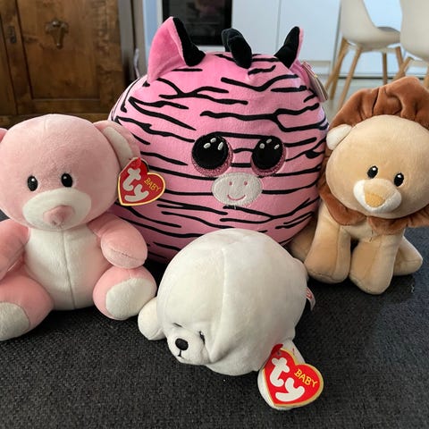 Ty pehmolelut lajitelma. Useita erimuotoisia ja -värisiä pehmoleluja, muun muassa nalleja, pupu, koira ja possu. Pehmolelut on valmistettu pehmeästä kankaasta ja sopivat lasten leikkeihin tai koristeeksi. Myydään yhteisenä settinä kuvien mukaisesti.