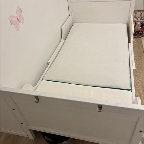 Uutena ostettu, yhden tytön käytössä ollut 2.5v. Hyväkuntoinen, vähän hampaiden jälkeä toisessa kaiteessa. Mukaan Ikeasta ostettu vetolaatikko suojalla.