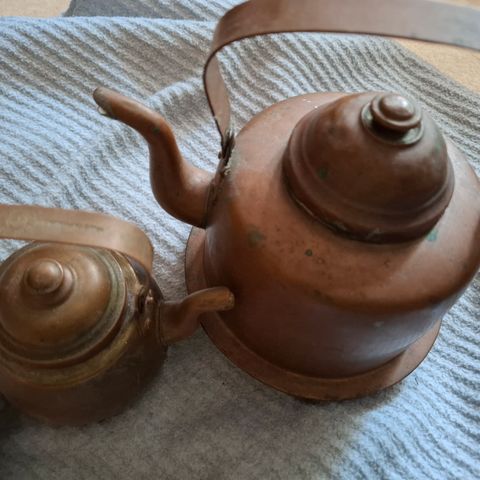 Kupariset padat, yhteensä 2 kappaletta. Molemmissa on metallinen kantokahva. Suurempi pata on noin 18–20 cm korkea ja pienempi noin 10–12 cm korkea (mitat kuvissa mittanauhan vieressä). Sopivat esimerkiksi sisustukseen, säilytysastioiksi tai koristekäyttöön. Kuparipinnassa näkyy käytön ja iän tuomia jälkiä.