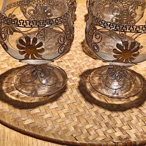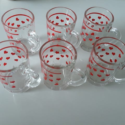 Lasien korkeus on 13,5 cm ja halkaisija on 8 cm. Lasit ovat hyväkuntoiset.