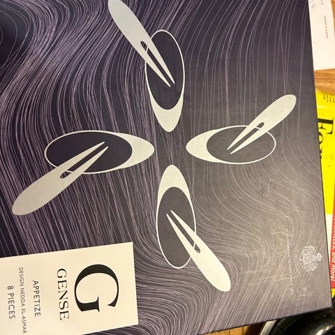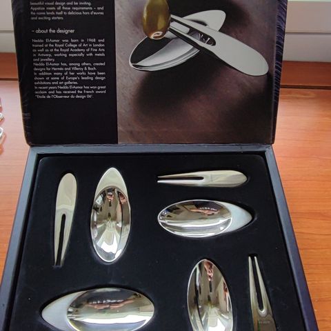 Gense Appetize aterinsetti 8 osaa ruostumattomasta teräksestä. Settiin kuuluu 4 pientä haarukkaa ja 4 pientä lusikkaa, jotka on suunniteltu erityisesti alkupaloille ja pikkusuolaisille. Moderni, ovaalinmuotoinen muotoilu sopii kattauksiin ja tarjoiluun. Näitä löytyy 2 settiä ja yhden hinta on 80e. Nouto Turku-Naantali tai postitus.