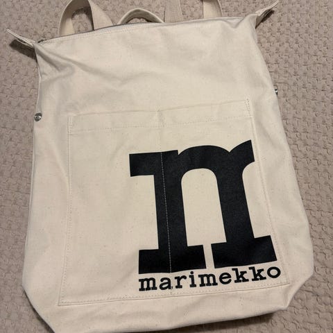 Marimekko Mono reppu harmaalla Unikko kuosilla. Repussa on suuri vetoketjullinen päätasku ja sisällä avotasku tietokoneelle. Edessä on kaksi ulkotaskua. Säädettävät olkahihnat ja kantokahva ylhäällä.