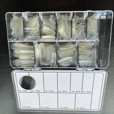 Noin 500 kpl erikokoisia uusia kynsitippejä. Kymmentä eri kokoa ja jokaisessa pussissa reilusti samaa kokoa (huom, en ole tarkasti laskenut, montako näitä yhteensä on eli onko 500 vai hieman vähemmän, mutta kuten pusseista näkyy, niin reilusti jokaista kokoa kuitenkin!).