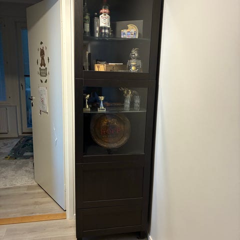 Ikea bestå korkeakiiltoinen vittiinikaappi. Toisessa kuvassa sivussa olevat virheet