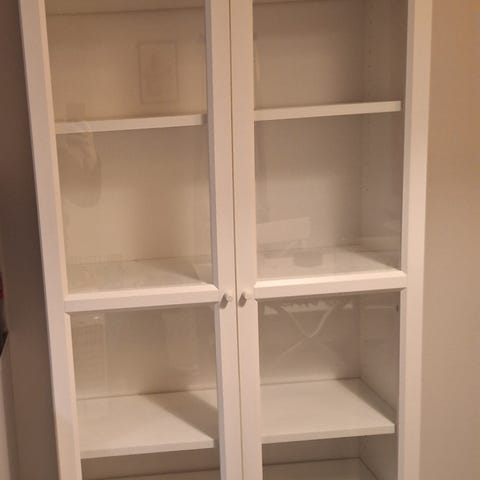Kuvan mukainen Ikean Billy hylly lasiovilla. Yhdessä hyllylevyssä kosteudesta johtuva jälki ja ylimmässä levyssä myös kosteudesta jälkiä.