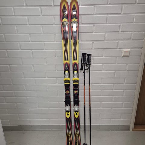 Vanhat mutta laadukkaat carving-sukset. Mukaan tarvittaessa tarjolla Atomicin monot 27,5-28.