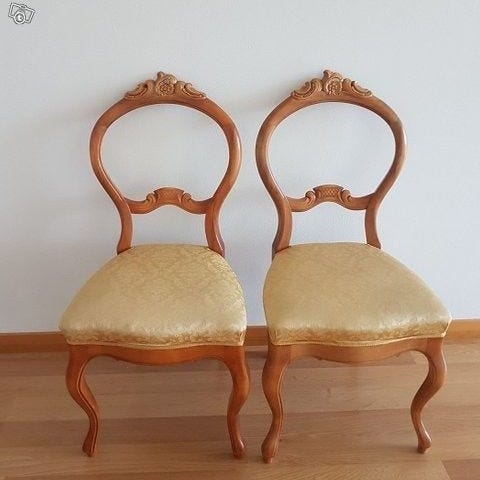 Antiikki tuolit,2 kpl. Tuoleissa on kaarevat jalat ja koristekuviointi. Kangasverhoiltu istuin. Rakenteeltaan ehjät, tukevat, hyväkuntoiset. Hinta 120e.