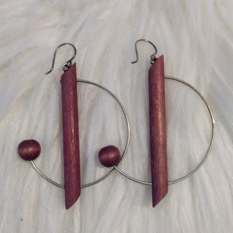 Aarikka naisten korvakorut, joissa pitkät riippuvat osat. Koukkukiinnitys hopeaa. Korujen pituus 6 cm ja leveys 2,5 cm.
