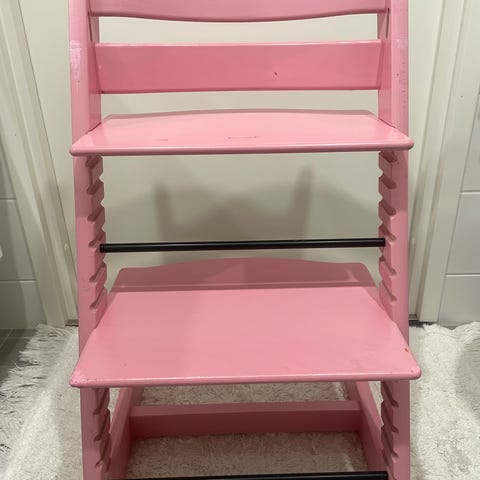 Stokke Tripp Trapp syöttötuoli. Materiaalina puu, väri valkoinen. Tuolissa on säädettävä istuin- ja jalkataso, jotka voidaan siirtää eri korkeuksille ja syvyyksille lapsen kasvun mukaan. Sopii käytettäväksi ruokapöydän ääressä lapsen tukevana istuimena. Tuolissa on metalliset tukitangot jalkatason alla lisäämässä rakenteen vakautta.