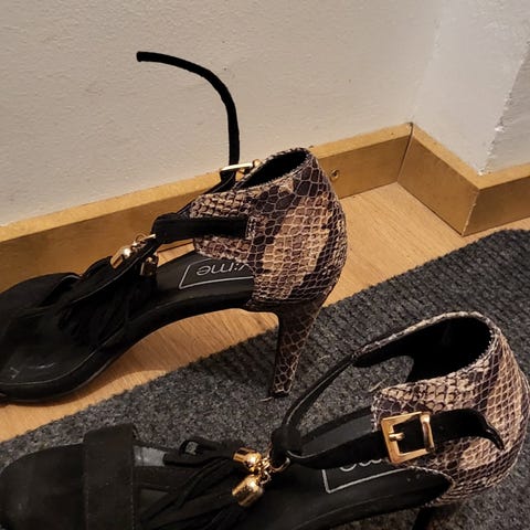 Naisten korkokengät, koko 38. Kengissä on matala korko ja terävä kärki. Päällinen on ruskeasävyinen, eläinkuviota muistuttava materiaali ja kärjet sekä kantaosa ovat mustat. Vuori on vaaleaa materiaalia. Sopivat esimerkiksi arki- tai juhlakäyttöön. Pohjat käytössä kuluneet, näkyy viimeisessä kuvassa. Muuten siistit.