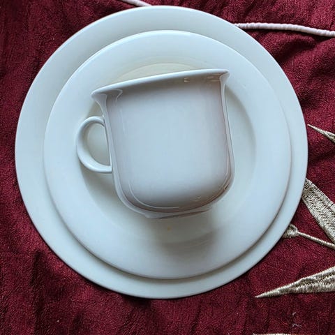 Arabia valkoinen astiasarja, pohjassa mallinimi Antarctica, kuosina Troikka.