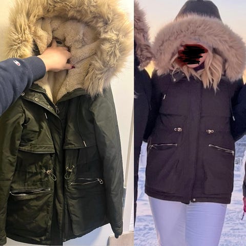 Kuvan mukainen takki irroitettavalla vuorella ja karvakauluksella.