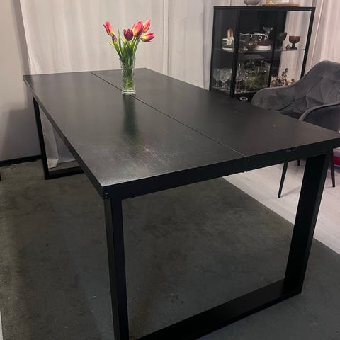 Hyväkuntoinen lankkupöytä valkoisilla metallijaloilla. Kansi on massiivimäntyä. Kannessa pieniä painaumia, mutta muuten yleisilmeeltään siisti.