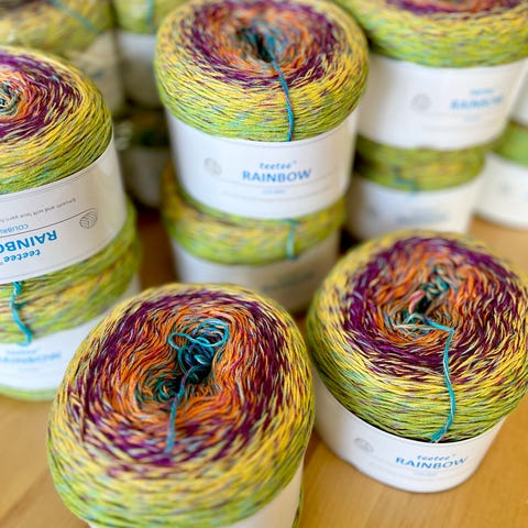 Teetee Rainbow on miellyttävän pehmeä puuvillasekoitelanka, joka on keritty lankakakun muotoon. Neuloessa langan värit liukuvat raidoiksi. Pinnan elävyyttä lisää langan muodostuminen neljästä säikeestä. Yhdestä kerästä neulot esimerkiksi pitsisen kolmiohuivin.